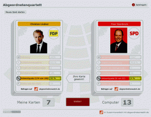 Anders als beim alt bewährten Autoquartett aus Jugendtagen geht es nicht um PS oder Hubraum, sondern um Antwortquote, Wahlergebnis und Anzahl der gehaltenen Parlamentsreden. Egal ob angeschlagener Parteichef oder Abgeordneter aus den hinteren Sitzreihen: beim Abgeordnetenquartett hat jede Karte eine Chance. Selbst wer im Parlament nie zu Wort kommt oder nur ein einstelliges Wahlergebnis erreicht hat, kann noch mit einer Top-Antwortquote auftrumpfen. Die Angaben auf den Spielkarten sind dynamisch und somit stets aktuell. Wer umgekehrt sein Antwortverhalten auf abgeordnetenwatch.de vernachlässigt, kann allerdings schnell vom Joker zur Verliererkarte werden.