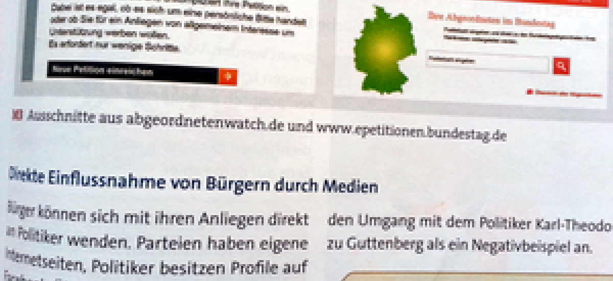 Es ist übrigens nicht das erste Mal, dass abgeordnetenwatch.de zum Gegenstand in einem Schulbuch wird. Das 2012 erschienende Lehrwerk "Internet und Politik" befasst sich in dem Kapitel "Watchdogs im Netz" u.a. mit den Antworten der CDU-Bundestagsabgeordneten Kristina Schröder, die Fragestellern auf abgeordnetenwatch.de in einem Standardschreiben mitteilt, nicht öffentlich antworten zu wollen.