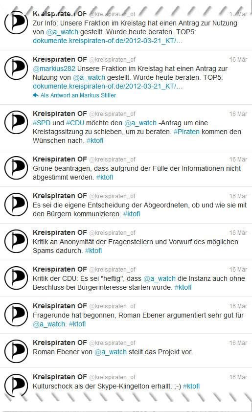 Freitag, 9 Uhr, Kreis Offenbach. Sitzung des Haupt- und Finanzausschusses - auf der Tagesordnung steht: abgeordnetenwatch.de. Die Piraten hatten beantragt, abgeordnetenwatch.de für den Kreis Offenbach im Ausschuss zu behandeln. Normalerweise geht die Initiative zu abgeordnetenwatch.de in einer Kommune oder einem Landkreis von Bürgerinnen und Bürgern aus und nicht von Politikerinnen und Politikern. Nun also mal andersrum – warum nicht?! Wir wurden gebeten, unser Projekt im Ausschuss per Skype-Live-Schaltung vorzustellen und kamen dem Wunsch gerne nach. abgeordnetenwatch.de in einer Ausschusssitzung vorstellen, wie kann das ablaufen? Wer schon einmal derartige Sitzungen besucht hat, weiß, dass diese sehr formal ablaufen. Das heißt: Tagesordnungspunkte müssen beantragt werden, über Änderungen der Tagesordnung wird abgestimmt – und ganz wichtig: Das Wort bekommt man vom Ausschussvorsitzenden erteilt.