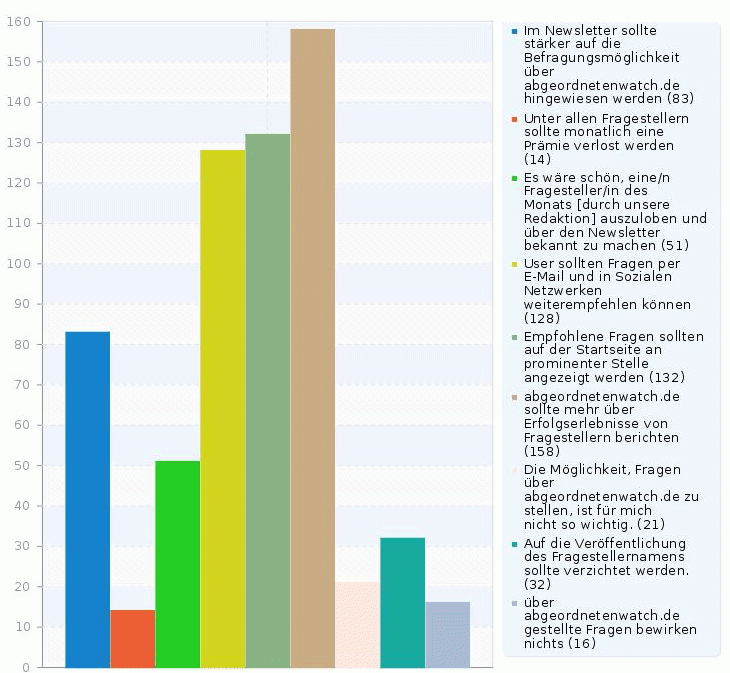 "Meine Meinung zur Befragungsmöglichkeit auf abgeordnetenwatch.de..." Mehr als die Hälfte der Nutzerinnen und Nutzer möchten über Erfolgserlebnisse anderer Fragesteller informiert werden. Des öfteren kommt es zum Beispiel vor, dass ein Abgeordneter eine Bürgerfrage zum Anlass nimmt, um eine parlamentarische Anfrage zu stellen. Hin und wieder führt die erste Kontaktaufnahme durch eine Frage auf abgeordnetenwatch.de zu einem Treffen von Bürger und Abgeordneten. Viele Besucherinnen und Besucher von abgeordnetenwatch.de möchte außerdem interessante Fragen und Antworten auf der Startseite vorfinden und per E-Mail oder über Soziale Netzwerke weiterempfehlen können.