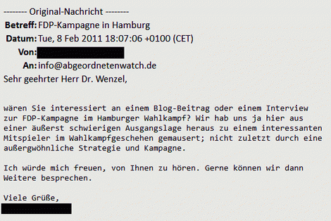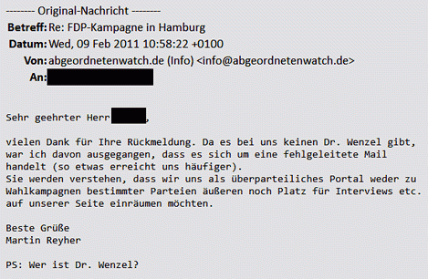 Wer nun der ominöse Dr. Wenzel ist, bleibt bis auf Weiteres ungeklärt, denn der Herr von der PR-Agentur meldete sich nicht mehr. Laut Homepage der PR-Agentur (Eigenwerbung: "Von unseren Leistungen können Sie hohe Qualität und Professionalität zum günstigen Preis erwarten") war es der Inhaber persönlich, der abgeordnetenwatch.de in die Wahlkampf-PR der FDP einspannen wollte. Ein Anfängerfehler als Erklärung scheidet aus, denn er verfüge über mehrjährige Berufserfahrung bei einer großen PR-Agentur, lässt der FDP-Berater auf der Website seines Unternehmens wissen, bevor er sich schließlich selbständig machte. Schon während seines Studiums lernte der heutige Agentur-Chef, wie man einer Sache den richtigen Spin gibt: U.a. arbeitete er für BILD und das Bundespresseamt. Für die Zeit des Bürgerschaftswahlkampfes hat der PR-Fachmann seinen Schreibtisch offenbar von einem Hamburger Außenbezirk, wo die Agentur ihren Sitz hat, in die Innenstadt verlegt. Denn die Mail-Signatur weist folgende Arbeitsstätte auf: