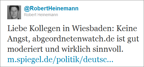 Was bedeutet all dies für einen Start von abgeordnetenwatch.de in Wiesbaden? Rein gar nichts. Sobald ein Bürger die notwendigen Angaben zu den Stadtratsmitgliedern in einer Exceltabelle zusammenträgt und uns zuschickt, werden wir auch in der hessischen Landeshauptstadt online gehen, Drohung hin oder her. Auch in Wiesbaden werden wir einen Start natürlich nicht von der Erlaubnis einzelner Politiker abhängig machen.