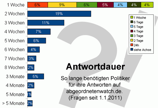 Rekordhalter ist übrigens Niels Korte, der 1.428 Tage oder drei Jahre und 332 Tage brauchte, um eine Frage zum Thema Volksentscheide zu beantworten. Hoffentlich war Kortes Antwort für den Fragesteller nicht wahlentscheidend. Denn die Frage stammte aus dem Bundestagswahlkampf 2005.