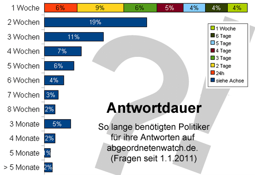 Die Hälfte aller Antworten trifft innerhalb der ersten 8,5 Tage nach Veröffentlichung einer Frage durch unser Moderationsteam ein. 6% der Antworten kommen sogar schon innerhalb der ersten 24 Stunden nach Freischaltung. Manchmal geht es auch ganz schnell, z.B. am 12. August 2011. Um 15:30 Uhr schalten wir eine Frage an den hessischen Landtagsabgeordneten Thomas Spies frei, genau zehn Minuten später ist die Antwort da, vier Minuten danach wird sie auf abgeordnetenwatch.de veröffentlicht und der Fragesteller per Mail benachrichtigt. Innerhalb einer Viertelstunde Frage – Antwort: Hochgeschwindigkeit. Wenn der Fragesteller sie dann auch noch als inhaltlich kompetent und zufriedenstellend empfindet - perfekt.