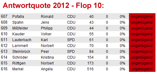 Bei den Antwortverweigerern liegt die Union vorn: Drei Viertel aller Abgeordneten mit der Note "ungenügend" stammen aus ihren Reihen (Note: ungenügend = keine einzige Frage beantwortet). Aber egal ob Koalitions- oder Oppositionspolitiker - wer ein "ungenügend" erhält, der ärgert sich darüber: