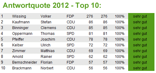 Zunächst: Wer sind die Abgeordneten, die heraus stechen, entweder weil sie bislang jede Bürgerfrage beantwortet haben oder noch keine einzige?