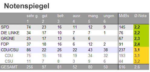 Wie im Vorjahr haben die Abgeordneten von SPD und Linken im Schnitt die besten Noten erhalten (Durchschnittsnote: 2,2), knapp gefolgt von den Parlamentariern von Grünen (2,3) und FDP (2,4). Ein größerer Abstand klafft dann zu den Unionsabgeordneten auf. Die Durchschnittsnote liegt wie im Vorjahr bei 2,6 (2010: 2,8).
