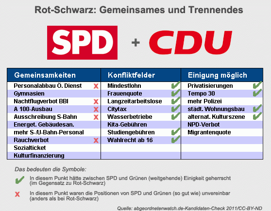Update 16:00 Uhr: Die Nachrichtenagentur dapd zitiert den Landes- und Fraktionschef der Berliner SPD, Michael Müller, mit den Worten, gebührenfreie Bildung sei für die Sozialdemokraten "nicht verhandelbar" (pdf). Damit deuten sich in der Tat schwierige Verhandlungen bei den oben genannten Themen "Studiengebühren" und "Kita-Gebühren für Gutverdiener" an, bei denen SPD und CDU gegensätzliche Positionen einnehmen. Laut dapd legt sich die SPD auch bei der Privatisierung von Landesunternehmen wie Vivantes, BSR, BVG und Wohnungsbaugesellschaften auf ein Nein fest. Wie oben bereits angedeutet, dürfte es trotz der Unentschlossenheit zahlreicher CDU-Abgeordneter in dieser Frage eine Einigung mit dem potentiellen Koalitionspartner kommen. In dem Agenturtext wird auch auf die obenstehende Analyse Bezug genommen.
