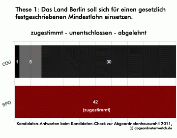 Hinweise: - Eine Auflistung der 25 Kandidaten-Check-Thesen und deren genaue Formulierung gibt es hier (pdf). - Abweichungen in der Summe der CDU-Abgeordneten bei obenstehenden Diagrammen ergeben sich, weil ein CDU-Abgeordneter nur einen Teil der Kandidaten-Check-Thesen beantwortet hat. - Der Kandidaten-Check wurde in den sechs Wochen vor der Abgeordnetenhauswahl am 18. September 2011 durchgeführt. Hierzu wurden die Direktkandidaten aller Parteien per Mail angeschrieben. Die Beantwortung der 25 Thesen erfolgte über ein Onlineformular. Die Kandidaten konnten ihre Auswahl optional mit 300 Zeichen begründen. Der Kandidaten-Check ist hier noch immer online. - Die Antworten eines Kandidaten können auf der jeweiligen Profilseite (Punkt "Kandidaten-Check") in unserem Archiv nachgelesen werden.