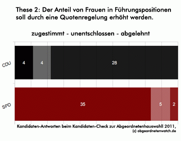 Der überwiegende Teil der SPD-Abgeordneten hält eine Frauenquote in Führungspositionen für erforderlich, lediglich zwei Politiker (Robert Schaddach und Fréderic Verrycken) lehnen dies ausdrücklich ab. Fréderic Verrycken begründete seine Position wiefolgt: „Es kann nicht angehen, dass Frauen immer noch schlechter entlohnt werden und in Führungsebenen weniger präsent sind, als Männer. Aber ob eine generelle Quote hier vom Großkonzern bis zum kleinen Mittelständler weiterhilft, da bin ich skeptisch.“ Vollkommen gegensätzlich ist das Meinungsbild in der CDU-Fraktion. Vier Abgeordnete sprechen sich für eine Quotierung aus (Christian Gräff, Cerstin Richter-Kotowski, Jürn Jakob Schultze-Berndt, Cornelia Seibeld) , der überwiegende Teil - 28 von 39 MdAs - ist jedoch dagegen. Quotenbefürworter Schultze-Berndt antwortete beim Kandidaten-Check: „Eine Beteiligung von Frauen in Führungspositionen wird das Bewusstsein um die Voraussetzungen für Vereinbarkeit von Familie und Beruf voranbringen. (Meine Frau ist übrigens gegen die Quote).“