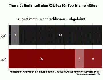 Als einziger CDU-Abgeordneter spricht sich Dirk Stettner für die Einführung einer CityTax für Touristen aus. Er könne sich eine "Auto-Tax" gut vorstellen - „allerdings nicht 'nur' für Touristen, sondern alle ohne 'B-' Kennzeichen.“ 31 Fraktionskollegen sind allerdings dagegen. In der SPD-Fraktion gibt es eine klare Präferenz für eine CityTax. 30 Abgeordnete gaben beim Kandidaten-Check an, sie hielten eine solche Touristensteuer für erstrebenswert, acht Abgeordnete sind gegensätzlicher Meinung.
