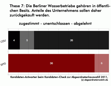 Auch hier sind die Positionen der beiden Parteien ebenso eindeutig wie gegensätzlich. Während sich die Mitglieder der SPD-Fraktion klar für einen Rückkauf der Berliner Wasserbetriebe aussprechen, lehnt der überwiegende Teil der CDU-Parlamentarier diesen Schritt ab. Innerhalb der CDU-Fraktion treten nur vier Abgeordnete (Emine Demirbüken-Wegner, Christian Gräff, Uwe Lehmann-Brauns, Peter Trapp) für eine Rekommunalisierung ein. Emine Demirbüken-Wegner im Kandidaten-Check: „Ja, das gehört zu Berlin! Nur, wenn der Senat die Grundwasserentnahmeabgabe senkte und die Gewinnausschüttung -die er zur Finanzierung seiner gemachten Schulden verwendet- reduzierte, dann wären erste Schritte zur Senkung der Wasserpreise auch ohne Rückkauf gemacht!“