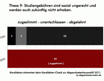 Ohne Ausnahme sprechen sich die SPD-Parlamentarier im Abgeordnetenhaus für ein beitragsfreies Studium aus. Beim potentiellen Koalitionspartner CDU schließen sich lediglich drei Abgeordnete dieser Position an: Christian Gräff, Dirk Stettner und Niels Korte. Korte erklärte beim Kandidaten-Check: „Aufgrund meiner Erfahrung als Lehrender an einer Hochschule lehne ich Studiengebühren ab. Denn sie tragen erheblich dazu bei, dass Studenten neben dem Studium arbeiten müssen. Das verzögert die Studienzeit erheblich. Auch aus finanzieller Sicht sind Studiengebühren nicht sinnvoll.“ Der CDU-Abgeordnete Stettner antwortete: „Bildung (Kita, Schule, Uni) soll generell beitragsfrei sein. Die Umverteilung erfolgt über die Steuern.“ Innerhalb der CDU-Fraktion gibt es allerdings eine eindeutige Mehrheit (28 von 39) gegen ein beitragsfreies Studium.