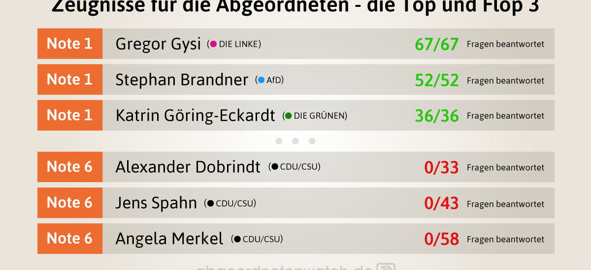 Die letzten zehn Plätze belegen insgesamt gleich fünf Abgeordnete von CDU/CSU, drei von der SPD sowie je eine*r von Grünen und Linken. Bei der AfD hat Alice Weidel die meisten Bürgerfragen unbeantwortet gelassen (insgesamt 13), bei der FDP ist es Alexander Graf Lambsdorff (vier unbeantwortete Fragen). Von den 709 Bundestagsabgeordneten reagierten 173 auf keine der an sie gestellten Fragen, insgesamt 659 mal blieb eine Antwort aus.