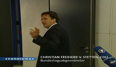 Bei Journalisten, die ihn mit kritischen Fragen und laufender Kamera behelligen, hat der Bundestagsabgeordnete Christian Freiherr von Stetten eine wirkungsvolle Abwehrstrategie: Er greift zum Telefon, wählt, und läuft dann - scheinbar ins Telefonat vertieft - dem Reporter einfach davon. Manchmal läuft er auch erst davon, um dann ganz demonstrativ zu telefonieren. So wie im Mai 2007, als ihn ein Reporter des ARD-Politmagazins Panorama in den Gängen des Bundestags abpasst.