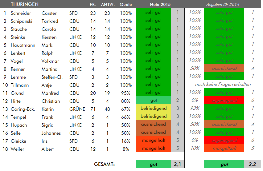 • für Thüringen und NRW: alle Bürgerfragen auf abgeordnetenwatch.de seit Beginn der Legislaturperiode im Oktober 2013 bis einschließlich 23. Juni 2015. Bei den Antworten lag der Stichtag am 7. Juli 2015.
