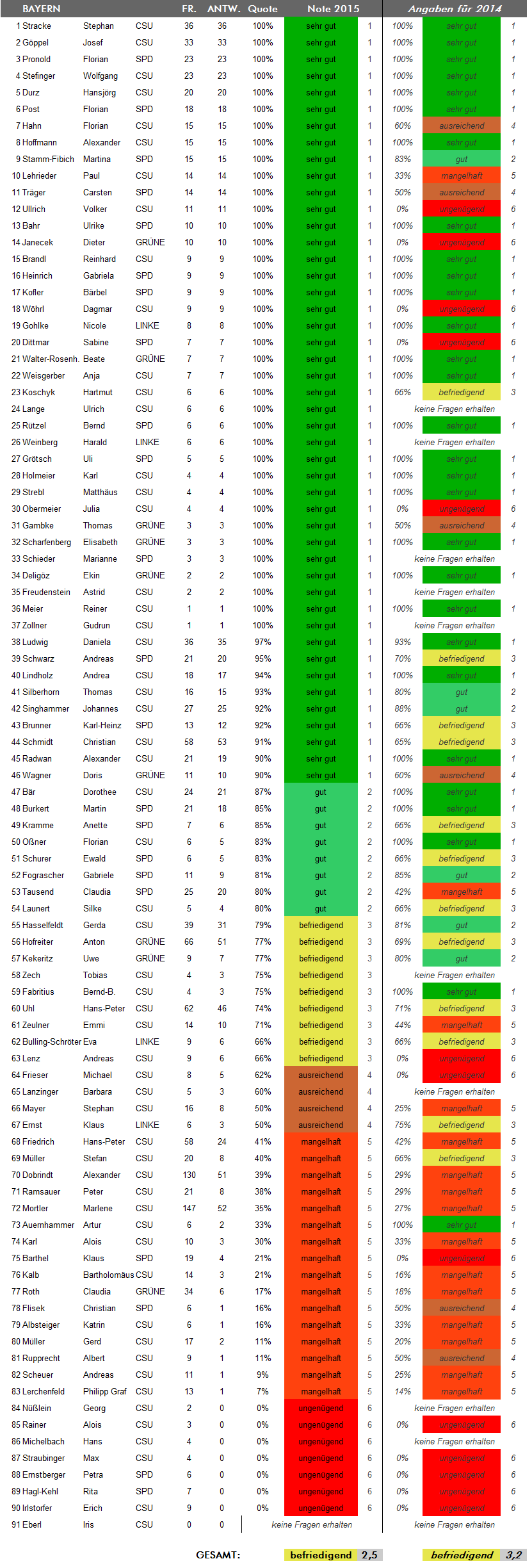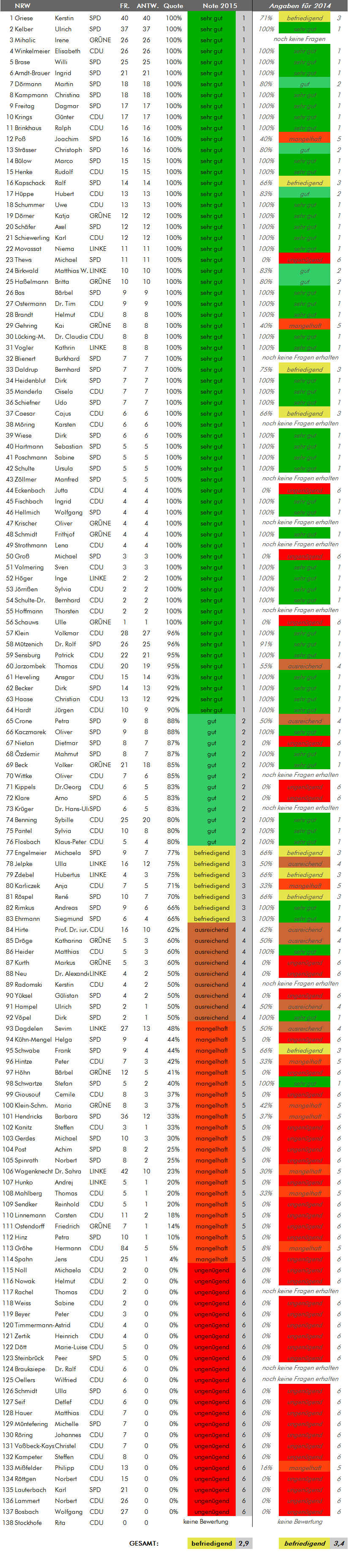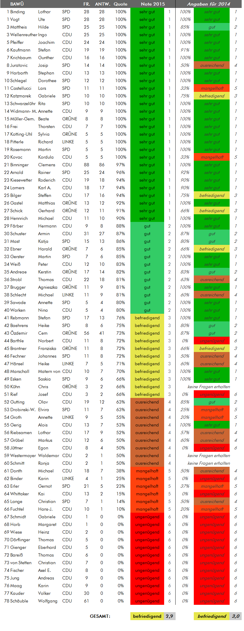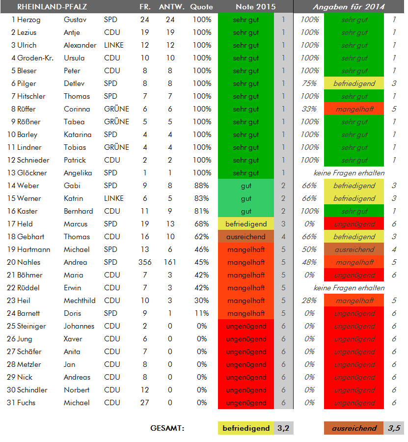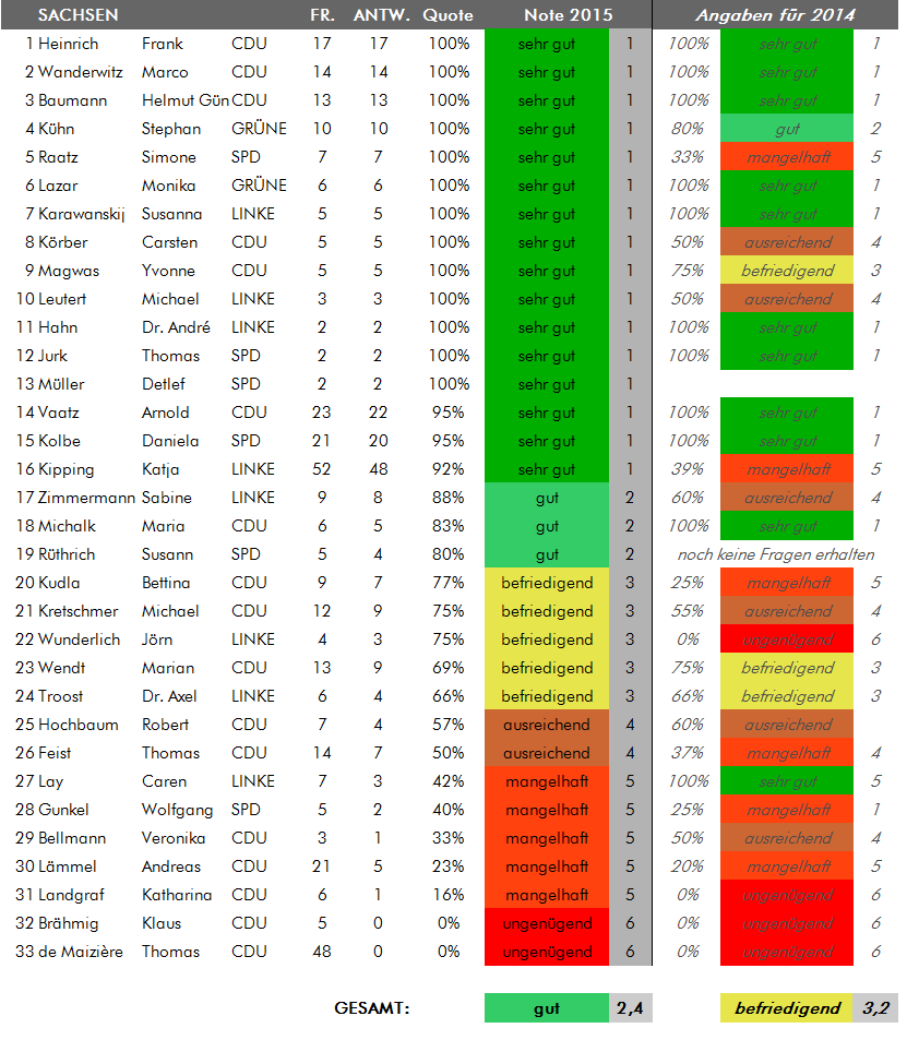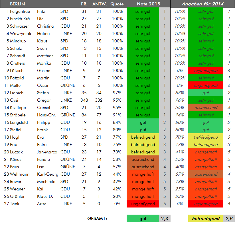 Wie hat Ihr Wahlkreisabgeordneter abgeschnitten? Das Ergebnis finden sie in der folgenden Übersicht. Die Listen sind alphabetisch nach Bundesländern geordnet, für die die Zeugnisnoten bereits feststehen (weitere Bundesländer werden nachgetragen, sobald dort die Sommerferien begonnen haben). Beim Klick auf die Grafik erhalten Sie eine Übersicht mit den Noten der Abgeordneten aus dem Vorjahr.