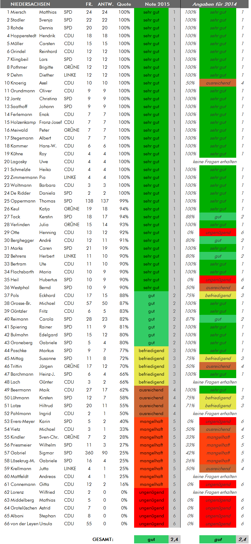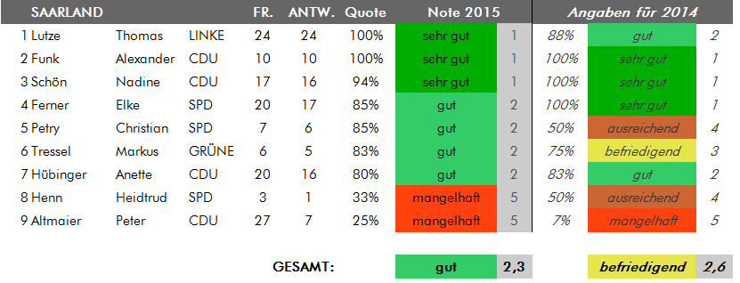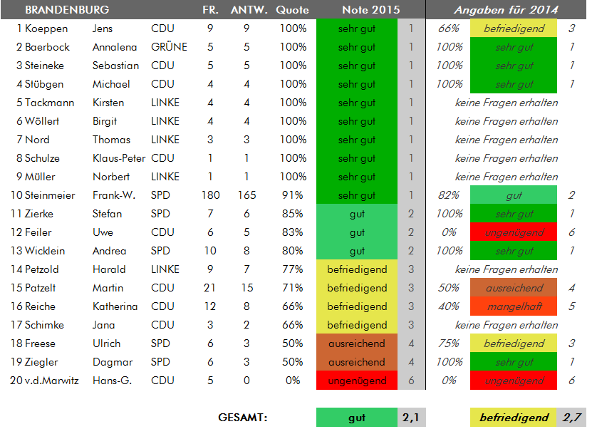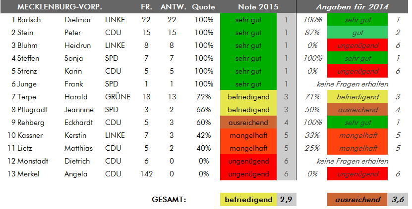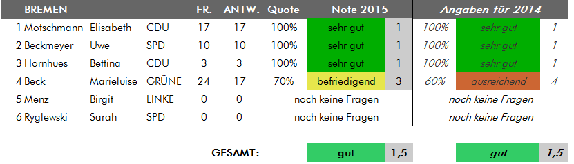 Anmerkung der Redaktion vom 21.7.2015: In der Übersicht für Schleswig-Holstein gab es zwischenzeitlich eine fehlerhafte Angabe für die Abgeordnete Valerie Wilms, die nun korrigiert wurde. Frau Wilms hat sämtliche fünf an sie gestellten Bürgerfragen beantwortet, was einer Antwortbilanz von 100 Prozent und damit einem "sehr gut" entspricht. Zuvor war in der Übersicht von fünf Antworten auf sechs Fragen die Rede gewesen. Wir bitten den Fehler zu entschuldigen.