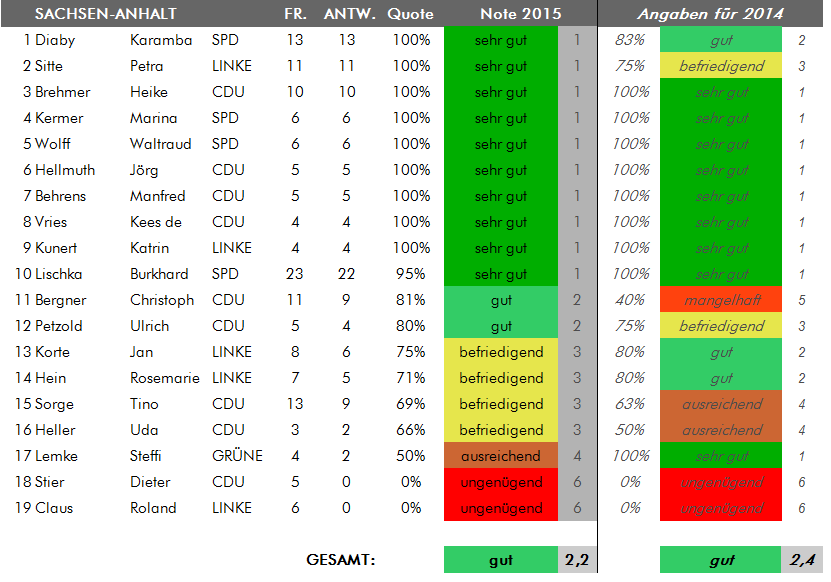 • für Sachsen und Sachsen-Anhalt: alle Bürgerfragen auf abgeordnetenwatch.de seit Beginn der Legislaturperiode im Oktober 2013 bis einschließlich 24 Juni 2015. Bei den Antworten lag der Stichtag am 8. Juli 2015.