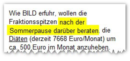 Tatsächlich handelte es bei den Äußerungen der Fraktionssprecher um gar kein Dementi, sondern um ganz viel heiße Luft. Denn niemand, nicht einmal BILD, hatte behauptet, dass eine Diätenreform in den Fraktionen ein Gesprächsthema sei, geschweige denn, dass ein Beschluss bevorstünde oder sogar schon gefasst worden sei: