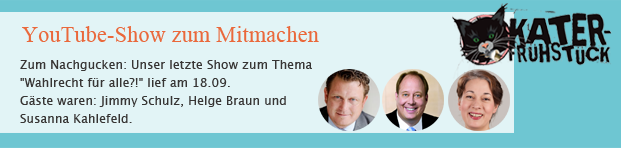 Anders bei "Katerfrühstück", der politischen Hangout-Show von DU HAST DIE MACHT und abgeordnetenwatch.de. Rund um die Bundestagswahl geht es in dieser Show darum, die Politiker der großen Parteien mit Jungwählern zusammenzubringen - und die Themen zu besprechen, die trotz 3 Millionen Erstwählern in der Politik oft zu kurz kommen: Die Themen von jungen Menschen. Und zwar dort, wo sich die meisten Erst- und Zweitwähler auch befinden: Im Netz.