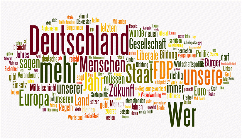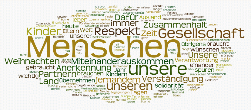 Mehr als eine Stunde dauerte gestern die mit Spannung erwartete Dreikönigs-Rede von FDP-Chef Guido Westerwelle. Mit dem freien Online-Tool "Wordle" lässt sich die Ansprache in einem einzigen Bild darstellen: Auch die Neujahrsansprache von Bundeskanzlerin Angela Merkel... ... und die Weihnachtsansprache von Bundespräsident Christian Wulff... haben wir einmal visualisiert. Lizenz: Der Text auf dieser Seite steht unter der Creative Commons Lizenz BY-NC-SA 4.0. Diesen Artikel teilen Diesen Artikel teilen E-Mail WhatsApp Telegram X Mastodon Threads Bluesky LinkedIn FacebookLink kopieren https://embed.abgeordnetenwatch.de/blog/parlamente/viel-deutschland-und-ein-bisschen-liebe