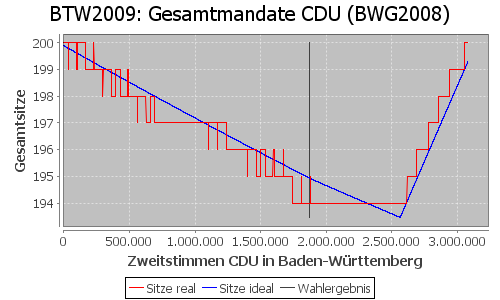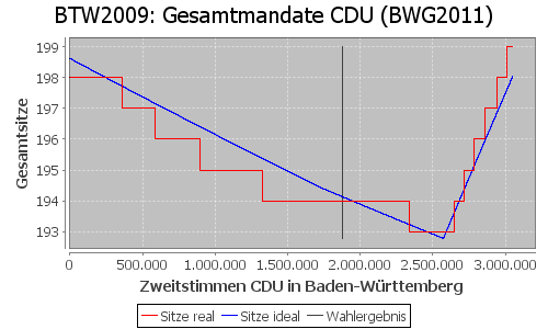 Am Beispiel des Bundestagswahlergebnisses 2009. Wenn die CDU damals 1.558.852 Zweitstimmen mehr (richtig verteilt auf die überhängenden Landeslisten) erhalten hätte, hätte sie nur 189 Sitze erhalten, fünf Sitze weniger. Es ist nicht zu rechtfertigen, warum die CDU nach der Wahl 5 Sitze mehr für das schlechtere Ergebnis bekommen sollte. Eine Korrektur bezüglich des negativen Stimmgewichts würde ihr insgesamt auch nur diese 189 Sitze zuteilen.