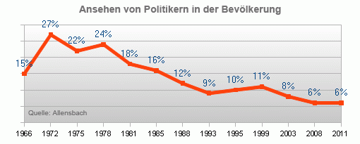 Man muss sich nur das Kommunikationsverhalten mancher Politiker anschauen um eine Ahnung davon zu bekommen, warum ihr Berufsstand inzwischen ganz unten angekommen ist im Ansehen der Bevölkerung, und das hat erst einmal nichts mit Atomausstieg oder der Möwenpicksteuer zu tun. Politische Wendemannöver und Klientelpolitik hat es immer gegeben. Allerdings hatten 1972 noch 27 Prozent der Bürgerinnen und Bürger ein positives Bild von unseren Politikern, sechs Jahre später waren es 24 Prozent, seitdem geht es bergab mit dem Ansehen: