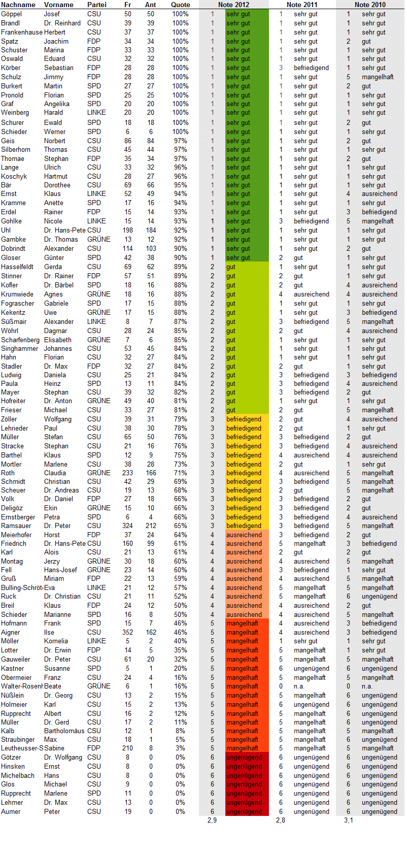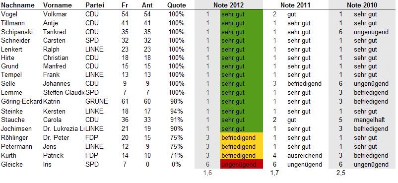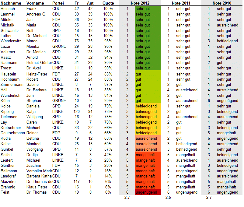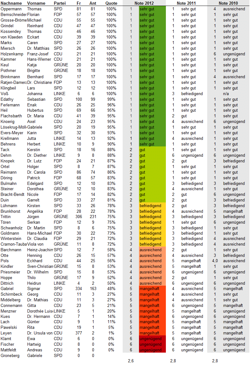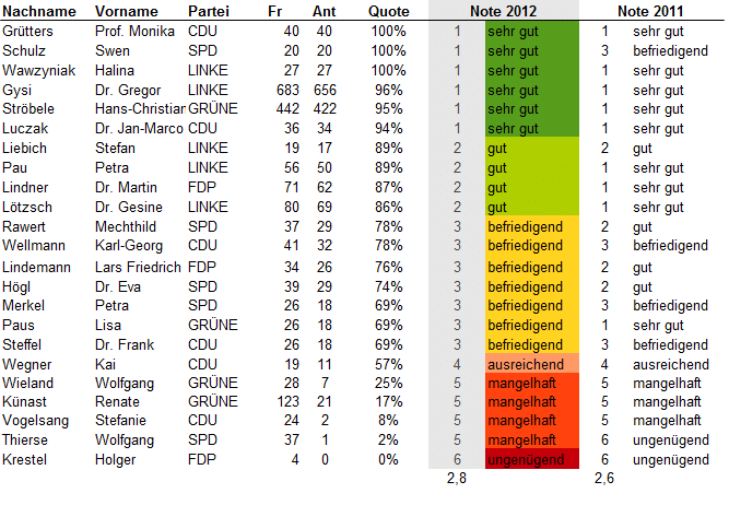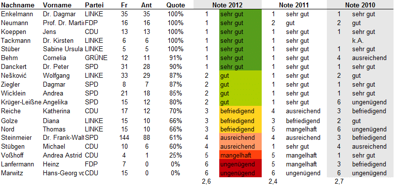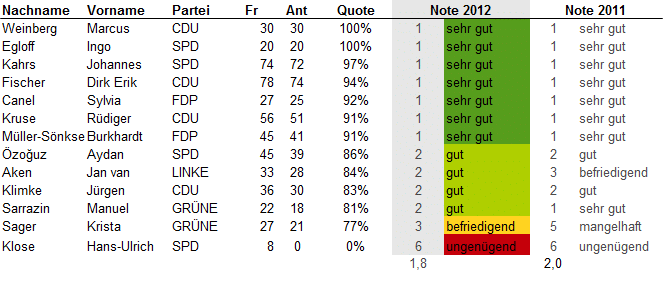 Update 25.7.2012: Bei Twitter oder über ihre Lokalmedien haben sich einige Abgeordneten zu ihren Noten geäußert. Eine Auswahl:
