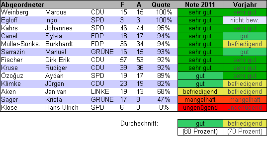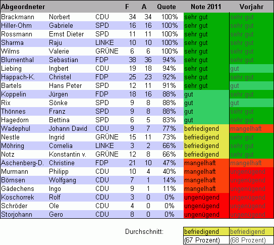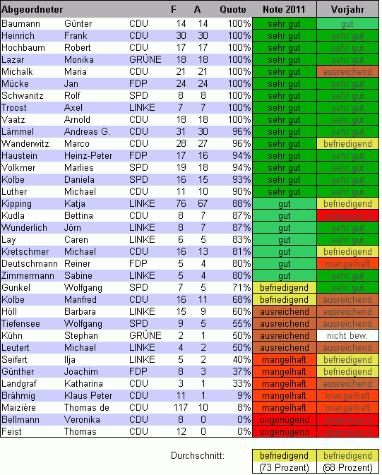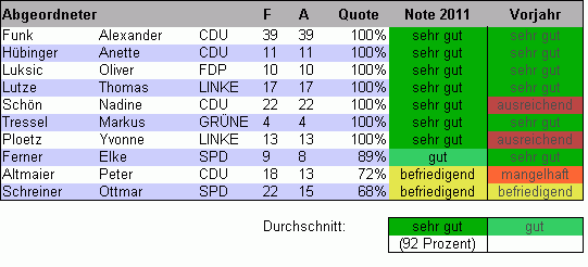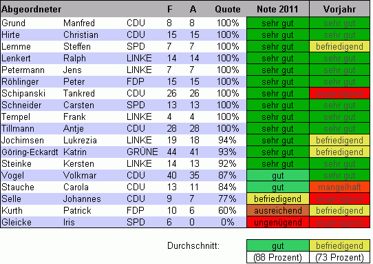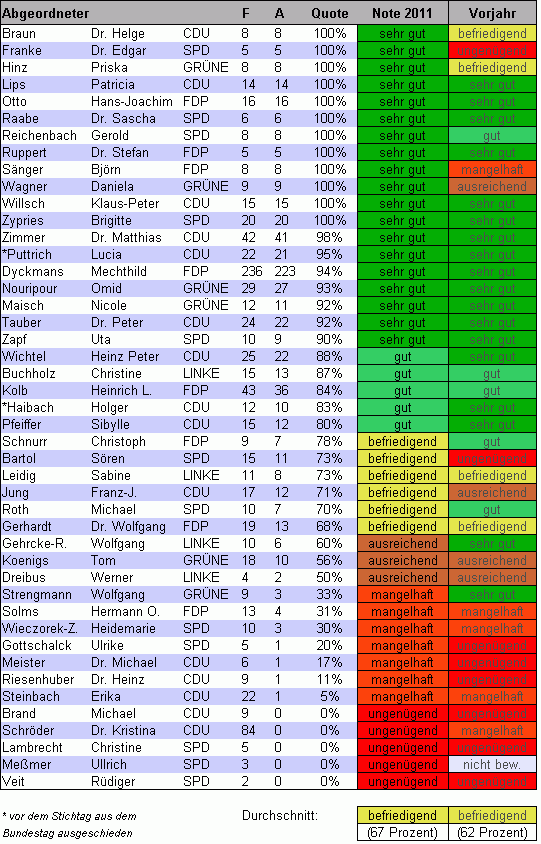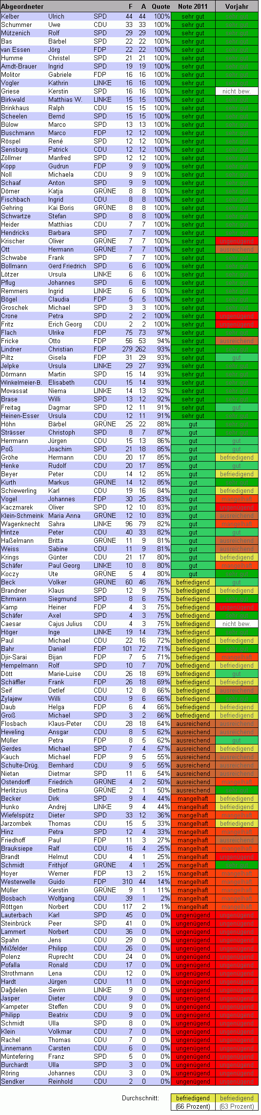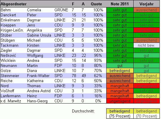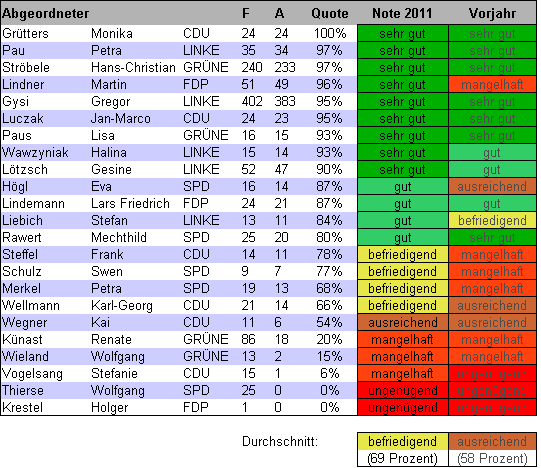 Um diejenigen Abgeordneten nicht zu benachteiligen, die erst vor kurzem eine Frage erhalten haben, wurden nur Fragen berücksichtigt, die bis 14 Tage vor Veröffentlichung der Zeugnisnoten gestellt wurden (im Fall des Saarlands war dies bspw. der 6. Juni 2011). In die Statistik eingeflossen sind alle Antworten, die bis zum Redaktionsschluss vorlagen (Bsp. Saarland: 20. Juni). Antworten mit standardisierten Texten, sog. “Standardantworten”, wurden als keine Antwort gezählt. Bewertungsrahmen: sehr gut: 100 – 90%, gut: 89 – 80%, efriedigend: 79 – 65%, ausreichend: 64 – 50%, mangelhaft: 49 – 1%, ungenügend: 0%. ("Nicht bew.": Bei diesen Abgeordneten handelt es sich um Nachrücker, die im vergangenen Jahre noch nicht im Bundestag saßen und deswegen nicht bewertet werden konnten.)