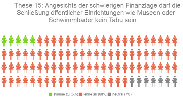 Viele öffentliche Einrichtungen werden von der Stadt bzw. Kommune betrieben und erfüllen wichtige Zwecke, wie z.B. Sportplätze oder Schwimmbäder, wo Schulkinder schwimmen lernen. 88% der teilnehmenden Kandidierenden finden, dass die Bereitstellung solcher Einrichtungen auch nicht beendet oder unterbrochen werden darf, selbst wenn die Stadt finanziell etwas schlechter da steht. Dies begründen viele mit der gesellschaftlichen Teilhabe, die sonst für einige Gruppen erschwert würden.