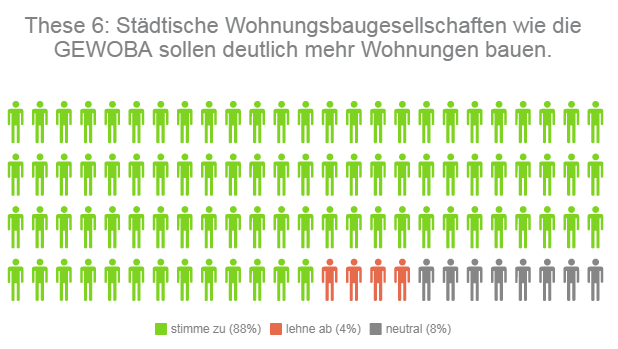 Die sechste These ist bislang die eindeutigste: Ja, der städtische Wohnungsbau soll ausgeweitet werden, sagen 88% aller teilnehmenden Kandidierenden. Nur 4% lehnen dies ab, 8% positionieren sich neutral.