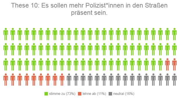 Mehr Polizei = mehr Sicherheit? Zumindest sollen nach dem Willen von drei Vierteln aller teilnehmenden Kandidierenden künftig mehr Polizistinnen und Polizisten auf den Straßen präsent sein. 11% lehnen dies ab, 16% verhalten sich neutral.