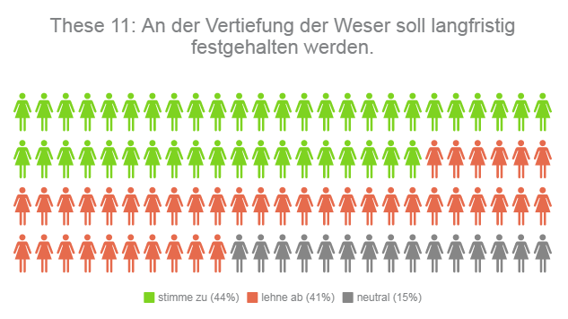 Soll die Weser doch vertieft werden? Die Frage spaltet die Kandidierenden: Die Ablehnung ist mit 41% nur leicht geringer als die Zustimmung mit 44%. 15% sind weder dafür noch dagegen.