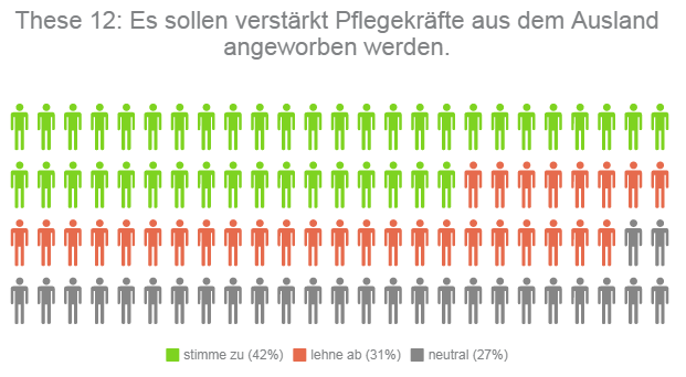 Ein bundesweites Thema, welches auch Bremen beschäftigt: Der Pflege-Notstand. Sollen Pflegekräfte aus anderen Ländern gezielt angeworben werden oder sollen andere Wege gefunden werden? Parteiübergreifend findet sich hier keine Mehrheit. 42% sind für die Anwerbung, 31% dagegen, mehr als ein Viertel positioniert sich neutral.