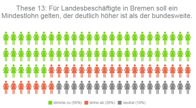 Die Kandidierenden der Regierungsparteien sind mit 97% (SPD) und 91% (Grüne) eindeutig für das eigene Projekt, auch aus der Linkspartei kommen 89% Zustimmung. Während sich 72% der CDU-Kandidierenden neutral positionieren, kommt Ablehnung gegen den Mindestlohn für Landesbeschäftige mit jeweils 89% aus FDP und AfD.