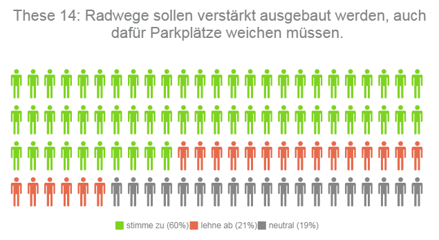 Einen Vorrang für Parkplätze wollen Mehrheiten aus der AfD (89% Ablehnung der These), der FDP (67%) und der Bürger in Wut (64%). 79% der CDU-Kandidierenden positionieren sich neutral und erwähnen in den Begründungen erwünschte Einzelfallentscheidungen und dass man im Falle einer Regierungsbeteiligung auch Radwege bedenken wolle. Grüne und Linke stimmen der These mit 100% und 95% (nahezu) geschlossen zu, auch die SPD ist mit 84% mit einer großen Mehrheit dafür.