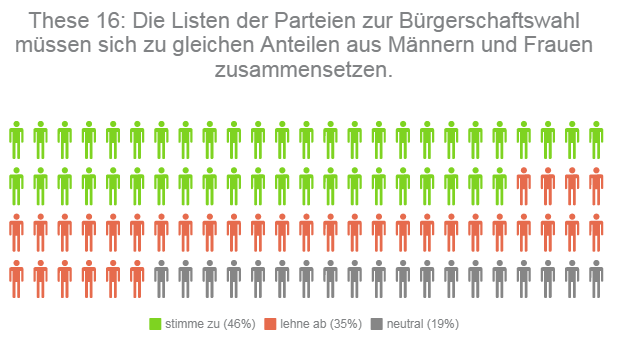 These 16: Die Listen der Parteien zur Bürgerschaftswahl müssen sich zu gleichen Anteilen aus Männern und Frauen zusammensetzen.