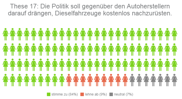 These 17: Die Politik soll gegenüber den Autoherstellern darauf drängen, Dieselfahrzeuge kostenlos nachzurüsten.