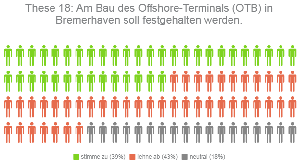 Das Offshore-Terminal in Bremerhaven bleibt ein spannendes Thema: 39% der teilnehmenden Kandidierenden wollen den Bau, 43% sind dagegen. 18% positionieren sich neutral.