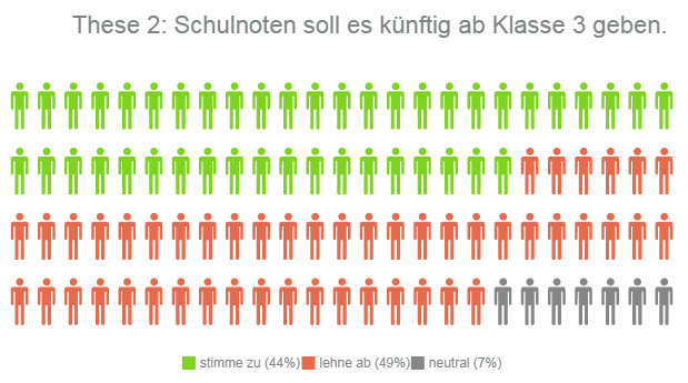 Die aktuelle Koalition ist sich einig: Mit 86% und 84% lehnen SPD und Grüne eine so frühe Notenverteilung ab. Die Linkspartei lehnt sie mit 100% vollständig ab, die Piratenpartei immerhin noch mit 67%. Zustimmung für Noten ab Klasse 3 kommt aus CDU, FDP, den Bürgern in Wut und der AfD (jeweils 100, 96, 92 und 89%).
