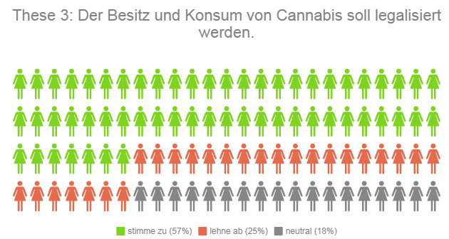 Ob der Besitz und Konsum von Cannabis legalisiert werden soll, wird immer wieder auch bundesweit diskutiert. Immerhin ein Fünftel der Kandidierenden positioniert sich neutral in dieser Frage. Eine Mehrheit von 57% stimmt der Legalisierung zu, ein Viertel ist dagegen.