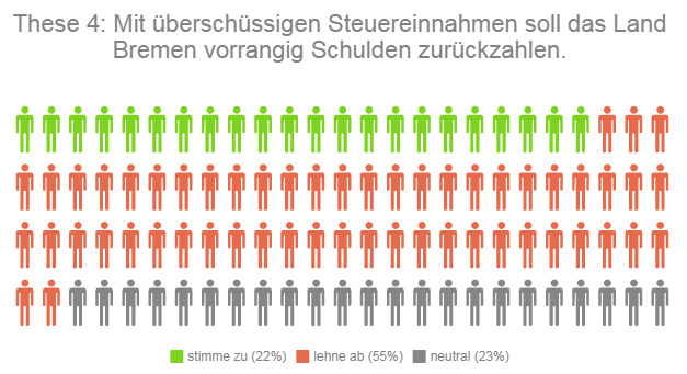 Ob Einnahmen zu Investitionen oder Schuldenabbau genutzt werden sollen, trennt ganze Wirtschaftsschulen voneinander – die Bremer Kandidierenden sind sich jedoch überraschend einig: Mehr als die Hälfte will auch neue Investitionen zulassen, nicht nur Schuldenabbau. 22% wollen eine klare Linie fahren und die Schulden reduzieren, ein Viertel ist neutral in der Frage.