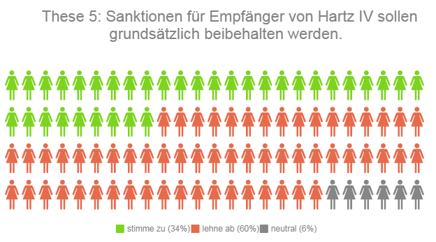 Die Sanktionen beibehalten wollen vor allem die Kandidierenden der CDU, FDP, AfD und Bürger in Wut (jeweils 87, 85, 83 und 75% Zustimmung zur These). Für die Abschaffung sprachen sich die Kandidierenden der Linken und Piratenpartei geschlossen aus, bei den Grünen mit 97% und SPD mit 90% ist das Ergebnis auch eindeutig. Die Freien Wähler sind sich uneins: 40% stimmten zu, genauso viele lehnten ab, der Rest verhielt sich neutral.