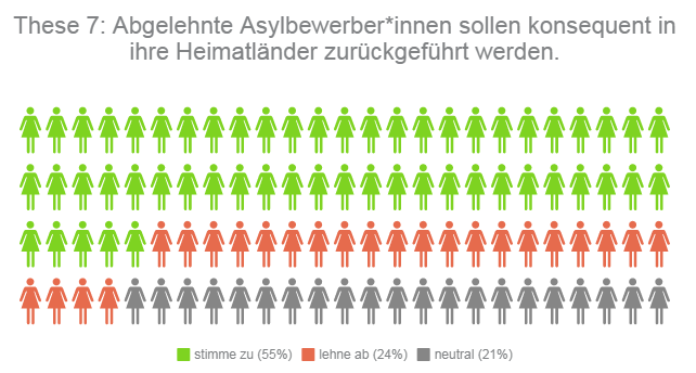 Eine knappe Mehrheit will abgelehnte Asylbewerberinnen und -bewerber konsequent zurückführen. Ein Viertel der Kandidierenden lehnt die automatisierte Rückführung ab, ein Fünftel positioniert sich neutral.