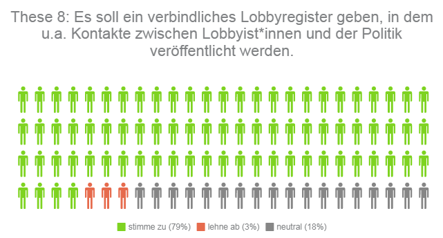 These 8: Es soll ein verbindliches Lobbyregister geben, in dem u.a. Kontakte zwischen Lobbyistinnen und Lobbyisten und der Politik veröffentlicht werden.