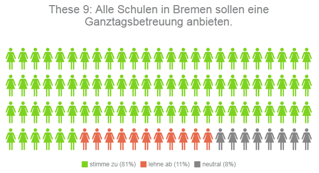 Die Ganztagsbetreuung wünschen sich 81% der teilnehmenden Kandidierenden für alle Bremer Schulen. 11% sind dagegen, 8% verhalten sich neutral.