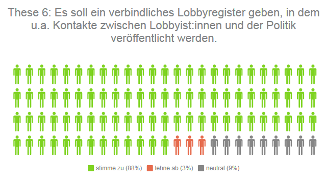 These 6: Es soll ein verbindliches Lobbyregister geben, in dem u.a. Kontakte zwischen Lobbyist:innen und der Politik veröffentlicht werden.
