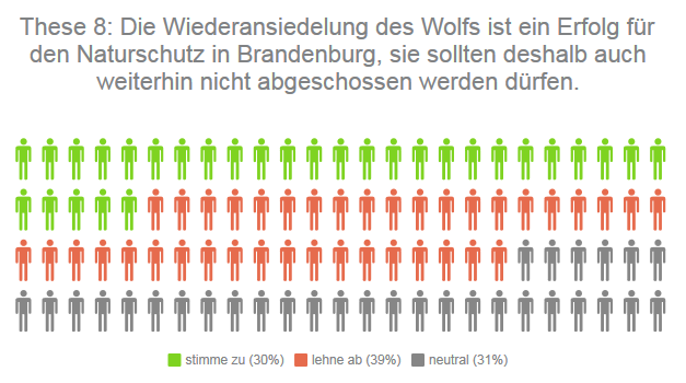 Die Rückkehr des Wolfes in Teilen des Landes erhitzt die Gemüter und spaltet: Soll er besonders geschützt oder abgeschossen werden? 30 Prozent der teilnehmenden Direktkandidierenden werten die Rückkehr als Erfolg, 39 Prozent dagegen nicht. Ein weiteres (knappes) Drittel positioniert sich neutral.