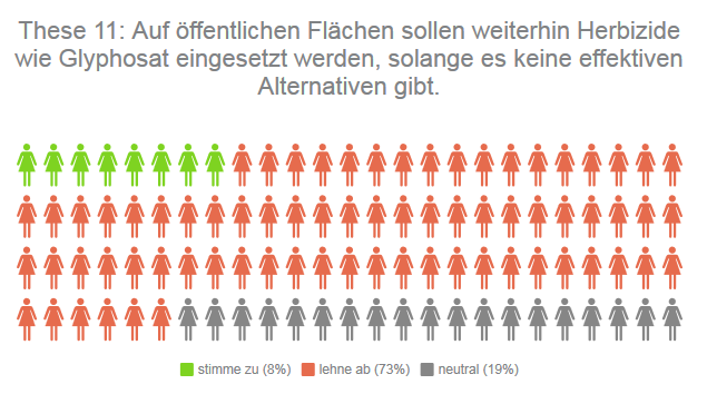 Der Einsatz von Herbiziden und Insektiziden ist umstritten – auf öffentlichen Flächen genau wie in der Landwirtschaft aber überwiegend Realität. Wie soll künftig damit umgegangen werden? Insgesamt 73 Prozent der teilnehmenden Direktkandidierenden sind dagegen, weiterhin Herbizide einzusetzen, nur 8 Prozent wollen die Praxis fortführen, 19 Prozent positionieren sich neutral.